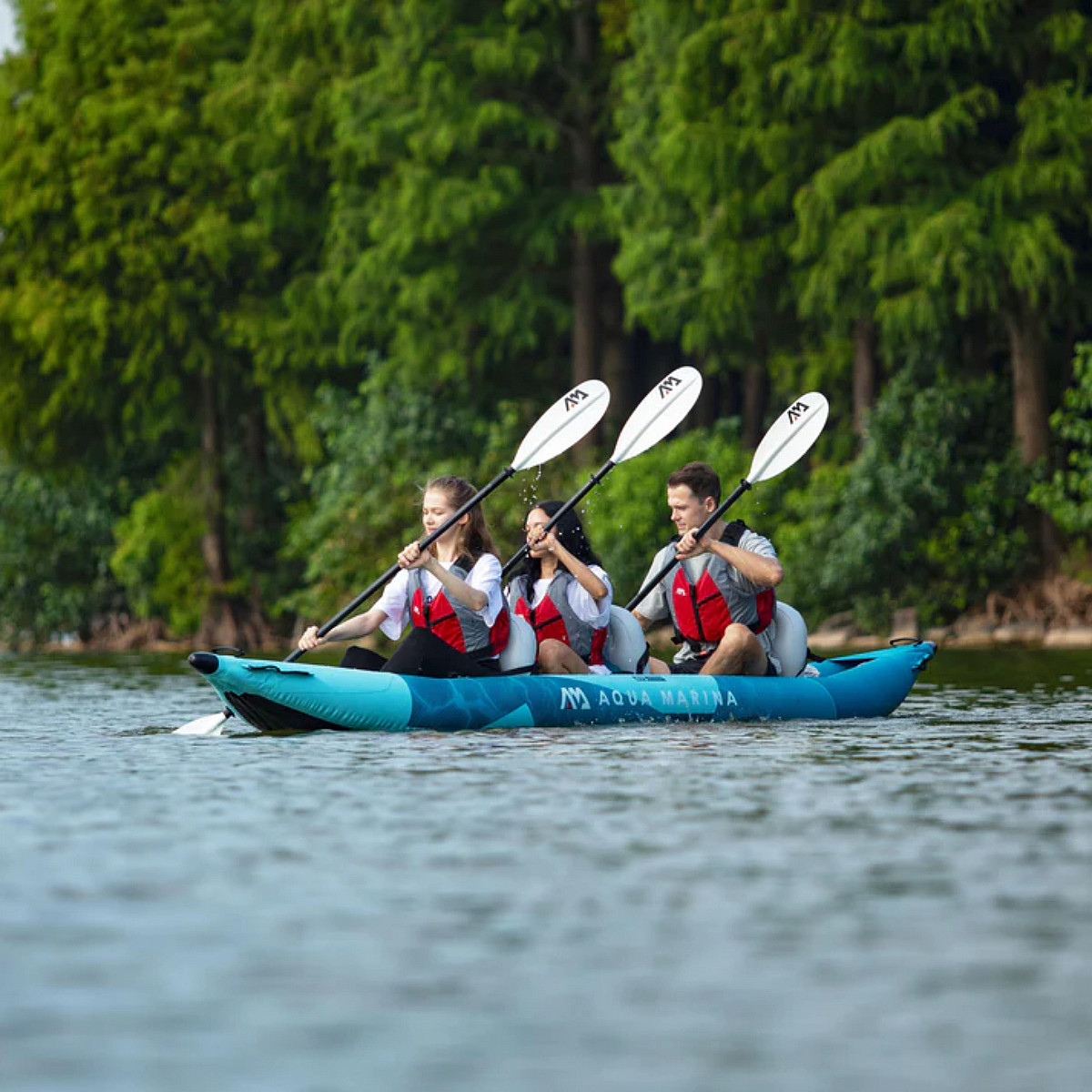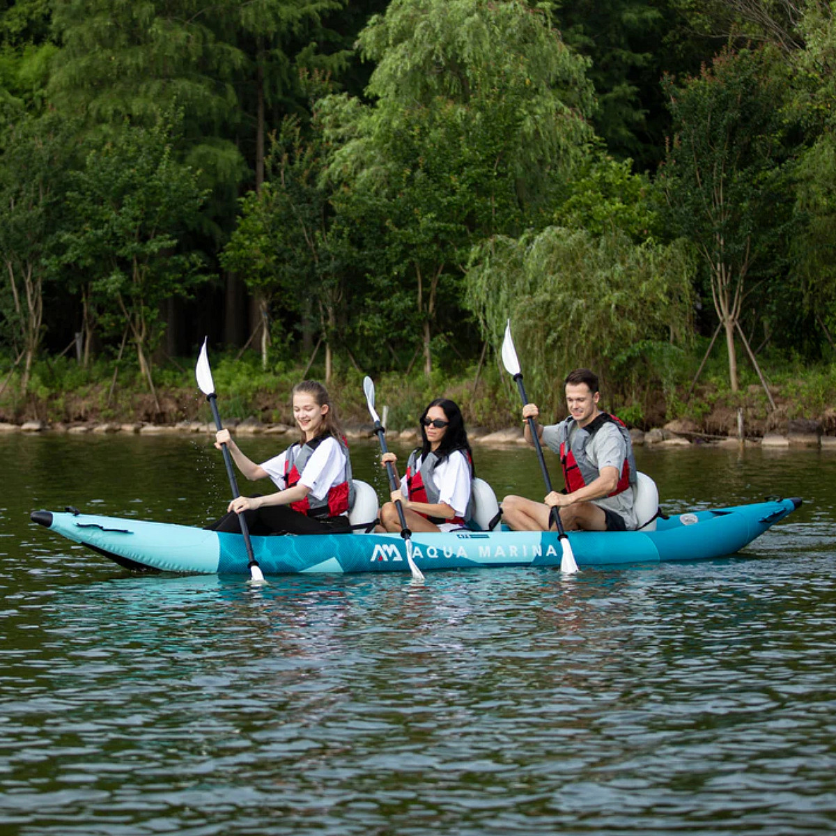 Wytrzymały, wzmocniony kajak pneumatyczny wykonany z wytrzymałego tworzywa PVC, a jednocześnie lekki, został zaprojektowany z myślą o maksymalnym bezpieczeństwie, stabilności i wydajności. Ten trzyosobowy kajak sprawdzi się zarówno na jeziorze, jak i na spokojniejszych nurtach. Łatwy w obsłudze i wszechstronny, ponton Aqua Marina pozwala na łatwe przechowywanie i użytkowanie.