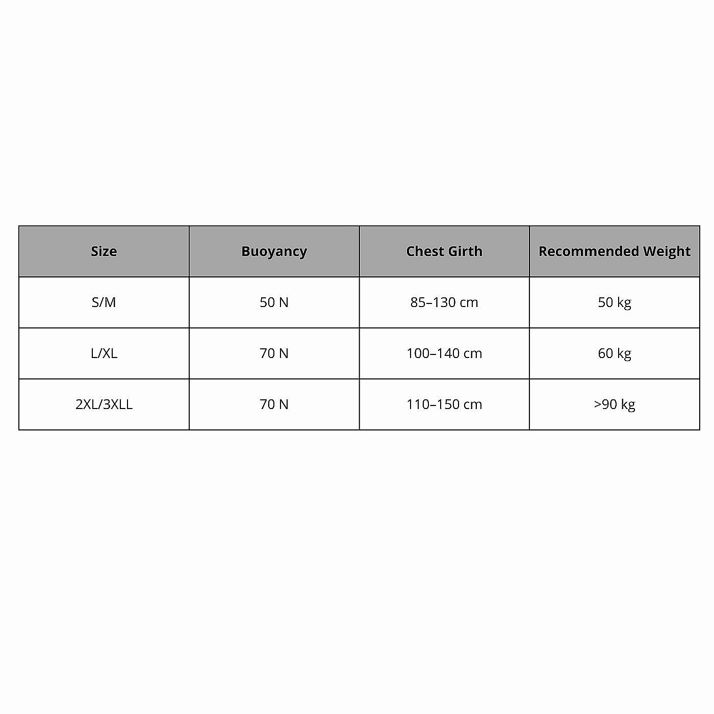 Przy wyborze kamizelki ratunkowej zalecamy kierować się przede wszystkim wagą użytkownika. Jeśli mieścisz się w górnym zakresie danego rozmiaru (np. L/XL), możesz również wybrać większą wersję (np. 2XL/3XL), którą można dopasować za pomocą pasków ściągających.