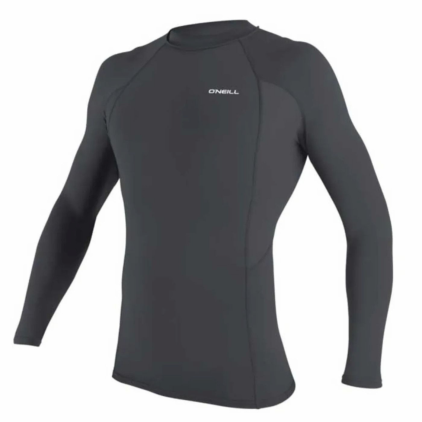 Sportowa męska koszulka z filtrem UV marki O'NEILL. Męska koszulka z lycry z długim rękawem i filtrem UPF 50 zapewni bezpieczną ochronę przed poparzeniem słonecznym, w nowym, minimalistycznym, ciemnoszarym wzorze.