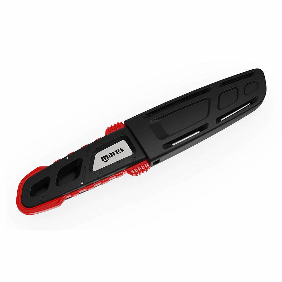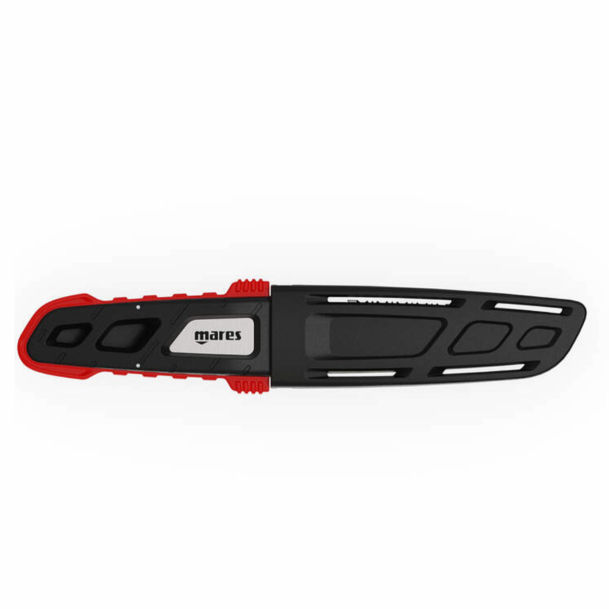 Nóż zaprojektowano tak, aby pasował do przelotek, co umożliwia wygodne umieszczenie noża w kamizelce Mares.