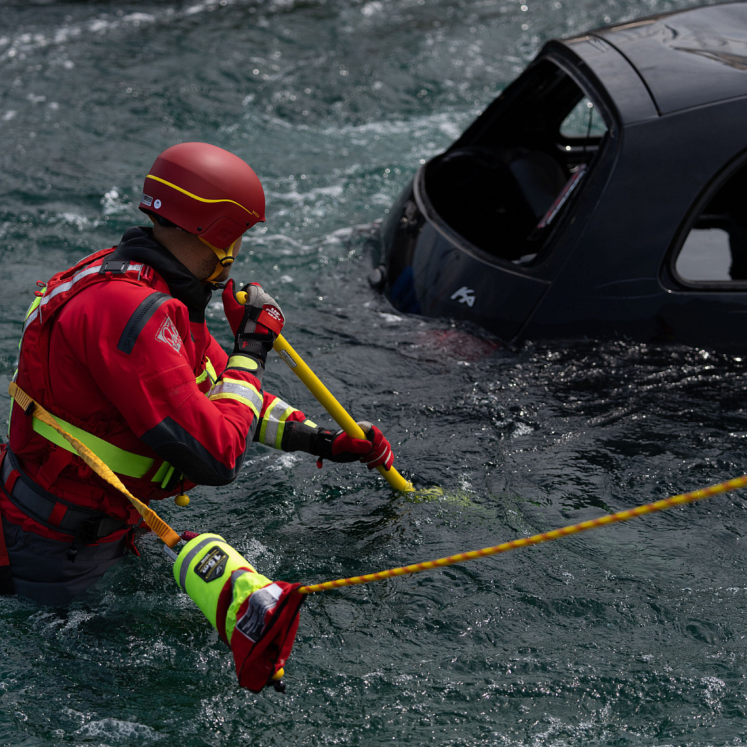 Ta pływająca kamizelka ratunkowa z elementami odblaskowymi kryje w sobie 25 m liny.
